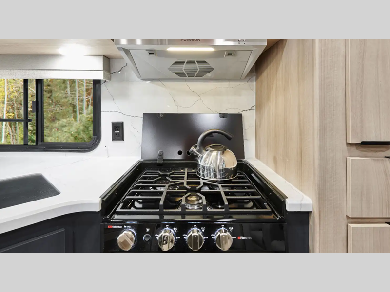 - Recessed 3 burner cooktop with backlit knobs and glass cover