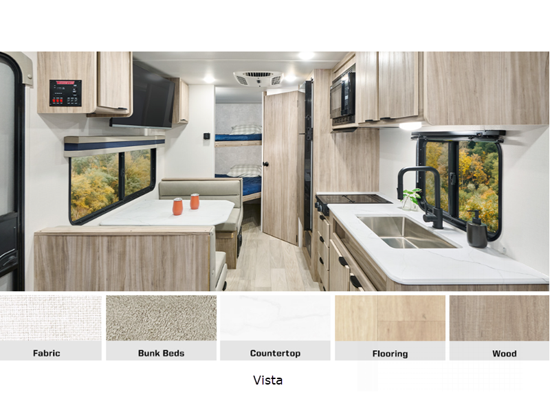 Sleeps 5 Length 21 ft 3 in Ext Width 8 ft Ext Height 10 ft 4 in Int Height 6 ft 8 in Interior Color Vista Hitch Weight 454 lbs GVWR 5100 lbs Dry Weight 3496 lbs Fresh Water Capacity 49 gals Grey Water Capacity 40 gals Black Water Capacity 40 gals Tire Size 225/75R15E Furnace BTU 18000 btu Number Of Bunks 2 Available Beds Queen Refrigerator Type 12 Volt Refrigerator Size 3.3 cu ft Cooktop Burners 2 Shower Size 30" x 36" Number of Awnings 1 Axle Weight 5100 lbs LP Tank Capacity 20 lbs Water Heater Capacity 6 gal Water Heater Type Gas/Electric DSI AC BTU 8000 btu Awning Info 12' Power w/LED Lights Axle Count 1 Number of LP Tanks 1 Shower Type Standard Similar Floorplans