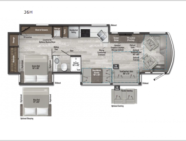 You can have many adventures of all sorts with this Forza Class A diesel motorhome! There is so much interior living space because of the three large slides, and there is also great relaxation found with the swivel/reclining cab seats, the BenchMark dinette, and the TrueComfort+ sofa. The private bedroom has quite a bit of storage space with its chest of drawers and full-width wardrobe, and there is also a 40" HDTV and queen-size bed with nightstands on either side. The kitchen is going to be amazingly helpful with its residential refrigerator, convection microwave, flip-up countertop extension, and pantry, and you will also love having a full bathroom with a 38" x 30" shower with seat, a textured glass shower door, and a bath skylight. You can also choose the optional Studio Loft drop-down bed on this model if you are needing more sleeping space!