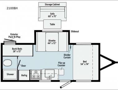 Get ready for a fun family weekend in the great outdoors with this trailer only steps away to enjoy inside comforts! The cook will love having everything to make warm meals, and can easily store leftovers in the 10.3 cu. ft. 12V refrigerator, plus the flip-up counter gives them more space to prep or dry the dishes. The front 54" x 74" full bed has a divider curtain for privacy at night and the rear corner 28" x 72" bunk beds are conveniently next to the private toilet and shower room. The booth dinette slide gives you a place to dine as well as sleep one more person, plus you will love the extra floor space that it provides. You might like to choose the EZ Glide Sofa Sleeper and table option in its place, the option is yours!