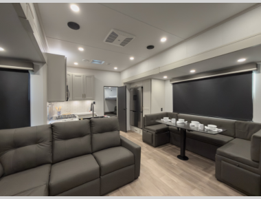 Five slide outs, a full bathroom with dual sinks, a half bath off of the kitchen, and a separate front living room and entertainment area!