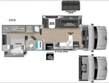 The Dynamax DX3 34KD Super C Diesel Motorhome features a king-size bed, residential kitchen, three LED Smart TVs, and a powerful 8kW diesel generator.