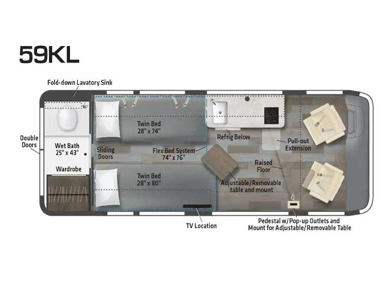 - Twin beds w/storage below passenger side (59K, 59KL)