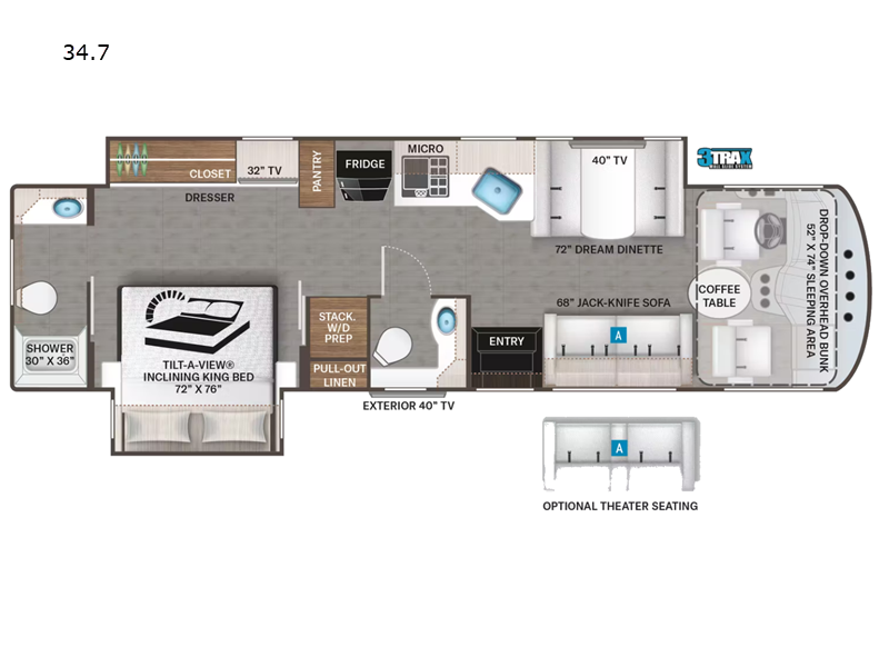 - Theater seating and a Dream Dinette® booth provide luxurious comfort for relaxation and dining.