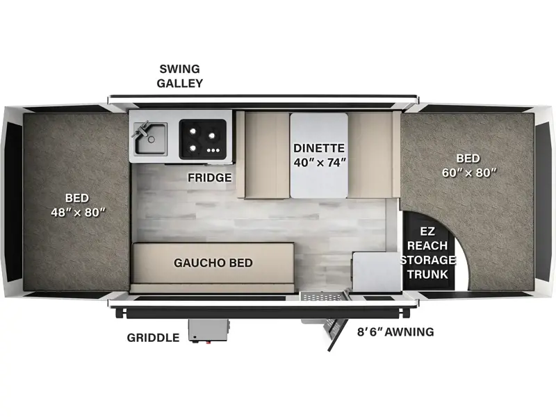 Spacious Sleeping Quarters: This pop-up camper sleeps up to 6 people comfortably, featuring a queen bed and a full bed, plus a convertible dinette. With plenty of room for everyone, you’ll enjoy restful nights after a day filled with adventure.