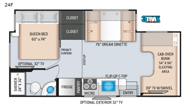 - Cab-Over Sleeping Area with Cup Holders, and Telescoping Bunk Ladder