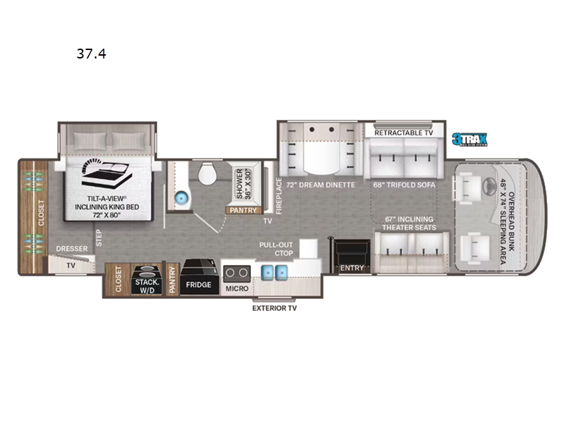 You can't beat the luxury you'll find in this motorhome that can sleep seven each night. You'll love waking up each day on your Tilt-A-View inclining king bed, and there is a full-length closet to store all your clothes. The stacked washer and dryer will allow you to start a load of laundry before you head to the kitchen for breakfast. Whether you're making eggs on the electric induction cooktop, or making oatmeal in the convection microwave, you're sure to find everything you need in this Palazzo kitchen. The main living area will be a spot everyone will love to gather in, especially with a Dream Dinette, a trifold sofa, plus inclining theater seats. There is an overhead bunk the little ones will love, and the retractable TV and fireplace will make this whole area feel more like home!