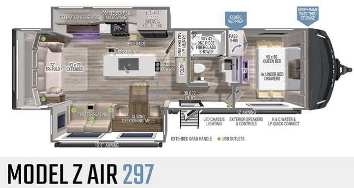 - Tech-Forward Features: Solar-prepped, Wi-Fi capable, and equipped with USB charging stations, the Model Z 297 Air ensures you stay connected on your adventures.