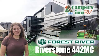 The 2026 Forest River RiverStone 442MC is a luxury mid-den fifth wheel built for full-time RV living, combining a residential-style interior with high-end construction, expansive storage, and a six-slide layout that maximizes usable living space. At approximately 44’4” in length with a 23,820 lb GVWR, this model is designed for stability, comfort, and extended-season capability. It rides on a heavy-duty chassis with advanced insulation, hydraulic leveling, and premium suspension components for long-distance towing and long-term stays.