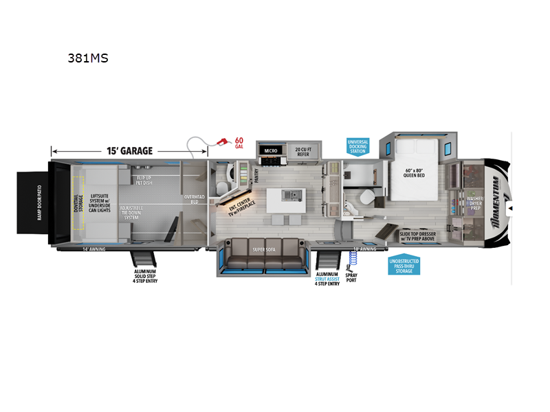 The Momentum fifth wheel toy haulers by Grand Design are built for four seasons of travel with your off-road toys and include luxurious accommodations throughout for extreme living! Each is constructed to a superior standard with the fully enclosed and heated underbelly and storage area, the 5-sided aluminum cage, and the triple insulated garage floor. The MORryde CRE3000 suspension system and rubber pin box, plus the upgraded axle hangers provide the performance and smooth towing you desire, while the interior offers luxury such as color changing LED accent lighting, hardwood cabinet doors with hidden hinges, and a central vacuum system. Each toy hauler also includes four packages, including the Garage Package with Tuff-Ply gas and oil-resistant flooring, the Weather-Tek Package with a Stealth AC System, and the Interior Luxury Package with solid surface countertops!