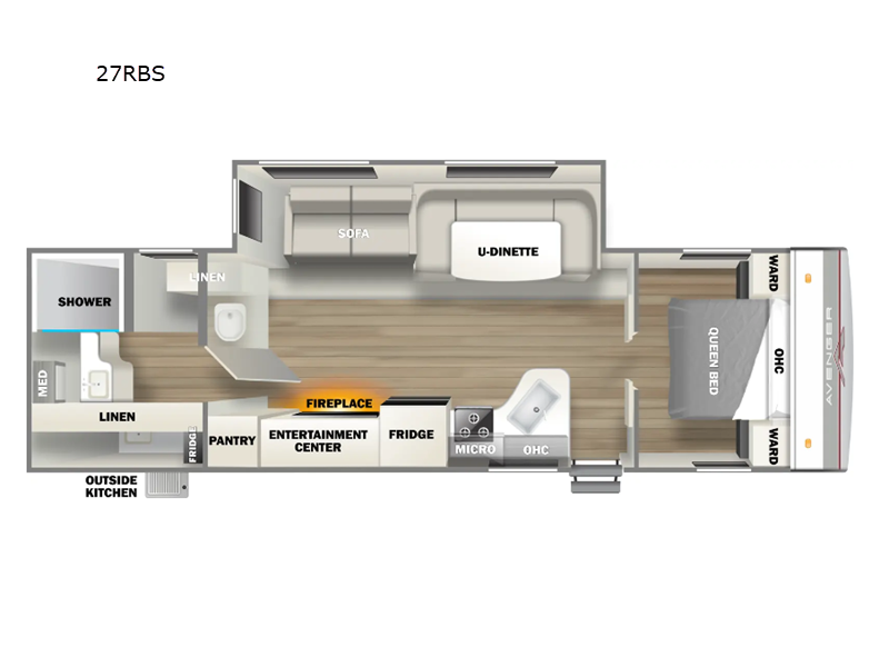 This Prime Time RV Avenger travel trailer provides several convenient and "must have" features that will check all the boxes! The three burner cooktop, 17" oven, and electric microwave will let you prepare meals each day, plus there is an outside kitchen to cook outdoors when the weather is nice. Once you are ready to turn in for the night, the walk-around queen bed in the front bedroom will deliver comfort while you sleep and the space saving sliding doors offer privacy. And any guests you may have can sleep on the U-shaped dinette and sofa within the large slide out! The main reason you might have wanted this trailer is the spacious rear bathroom with two linen closets and plenty of space to get ready each morning.