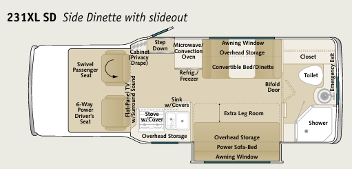 While compact in size, the 231XL surprises with a slide-out dinette or sofa, instantly increasing your interior space when parked. This added room makes mealtime, lounging, or entertaining that much more comfortable — without the bulk of a larger motorhome.