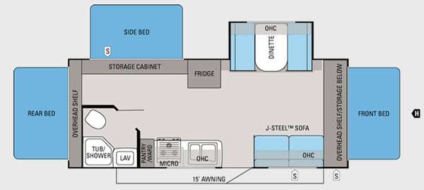 Take your adventures outside with the large awning that provides shade and protection from the elements, perfect for relaxing outdoors. Plus, the ample exterior storage offers space for all your camping gear, so you can easily bring everything you need for the great outdoors.