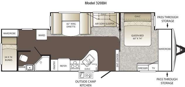 Front Full Wall Wardrobe with Pass-thru Storage: This large wardrobe is great for keeping clothes and gear organized. The pass-thru storage at the front is perfect for stowing larger items or outdoor gear.