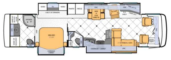 Step inside and you’re welcomed by a luxuriously appointed interior featuring handcrafted hardwood cabinetry, polished solid-surface countertops, and plush residential furnishings. The open floorplan creates a spacious, upscale atmosphere ideal for extended travel or full-time living. Large panoramic windows, elegant lighting, and premium finishes provide a warm, residential feel wherever the road takes you.