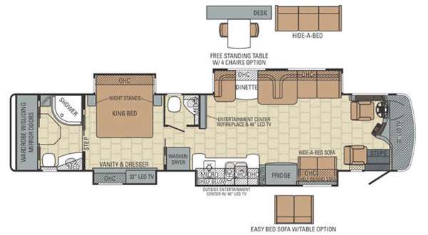 Stepping inside the motor home, along the passenger side there is a slide with a hide-a-bed sofa or an optional easy bed sofa with table, refrigerator, pantry, double kitchen sink, and two burner range. Next to the slide you will find a washer and dryer. The opposite side of the motor home has a slide with a sofa and dinette ensemble, or you can choose an optional hide-a-bed and free-standing table with chairs. There is an entertainment center with a fireplace and a 46" LED TV. Above the driver and passenger seat you will find a 32" LED TV