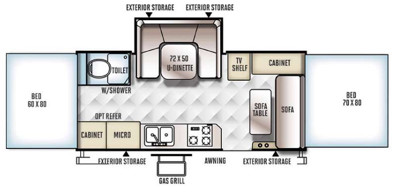 The 29SC features two large tent-end beds, offering plenty of sleeping space for up to six people. The slide-out dinette provides extra room inside, creating a spacious and open living area for dining, relaxing, and entertaining.