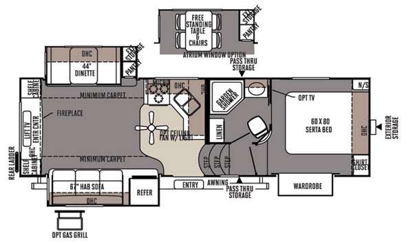 Storage is not a problem with the interior overhead cabinets and the exterior pass thru storage. Outside you can even enjoy an optional gas grill.