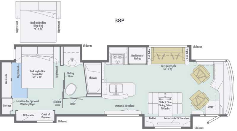 Step inside along the passenger side and you are greeted by a spacious interior when you glance back through the coach. The dual opposing slides in the front give it an open concept feel. There is a slide out Glide and Dine table with chairs just behind the passenger seat. This also includes a buffet with storage and the location for a retractable TV if you choose to add. Just off to the side of the slide you have the option of adding an electric fireplace.