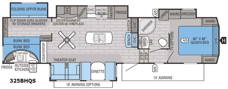 If you are looking for a fifth wheel with plenty of space for your kids yet plenty of living space for the adults, you have found it in the Eagle 325BHQS bunkhouse by Jayco with QUAD slides.