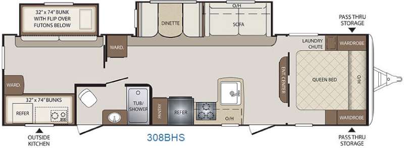 Pass-through storage, cabinets throughout, and bunkhouse compartments make packing simple.