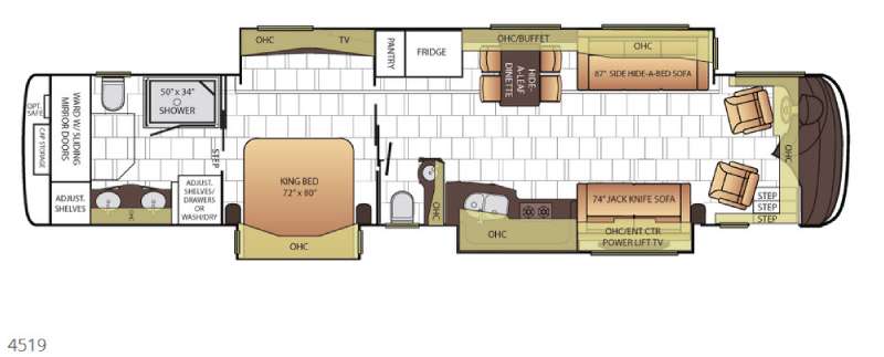 High-End Interior: Includes two comfortable sofas (jack-knife and hide-a-bed), a buffet dinette with a hide-a-leaf table, and a large power lift TV.