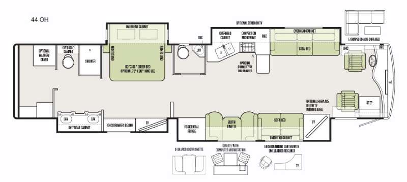 - Slide behind passenger seat includes sofa bed, booth dinette, TV, and optional fireplace