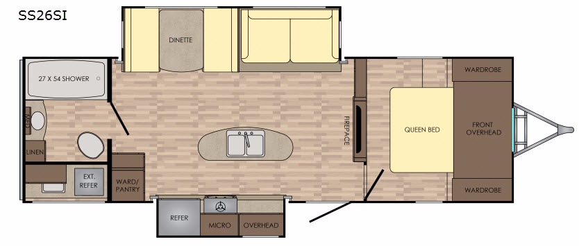 The rear bath layout and outdoor kitchen are what sets this CrossRoads Sunset Trail Grand Reserve unit apart from the rest. This model SS26SI offers a spacious interior with a rear full bath, and the ability to cook either inside or outside.