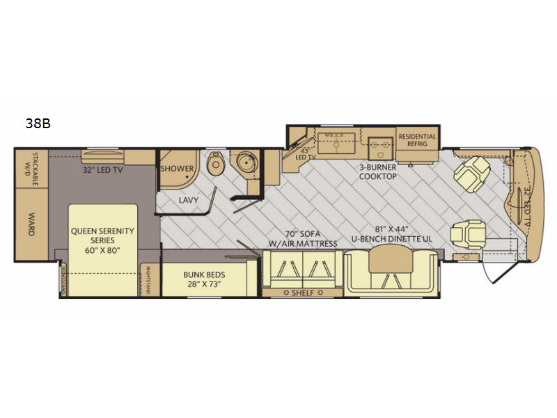 | Basement Storage | 224 cu. ft. | TV Info | Above Cab 32" LED TV, Bedroom 32" LED TV, |