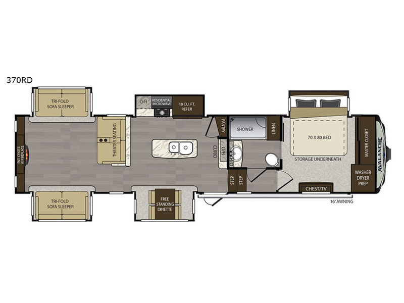 The Avalanche 370RD offers the perfect combination of space, luxury, and functionality. With five slides, a stunning entertainment center, and a full kitchen island, it feels like a home on wheels. Enjoy comfort in every corner—from the king bed suite to the relaxing rear living area.