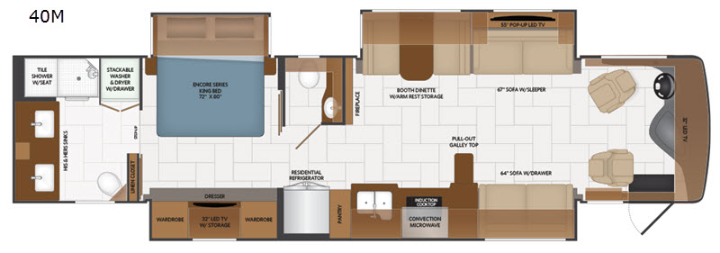Fleetwood Discovery LXE 40M class A diesel coach highlights: Bath and a Half Double Sink Vanity Sofa Sleeper Fireplace Dishwasher Exterior 48" TV You are sure to love this diesel coach with modern style and many conveniences you want and needy while away from home! Just imagine having your own full bathroom with two sinks and a seated shower, plus a stackable washer and dryer. You can offer your guests the half bath when they are visiting which is mid-coach. You can also provide enough seating with the swivel captain's chairs, a booth dinette, a sofa sleeper and an extra sofa with drawers. Everyone will enjoy the fireplace and the 55" pop-up LED TV when wanting to catch the big game. Or you can take the party outside to watch the 48" LED TV under the electric awning. You will find more features such as dishwasher, hardwood ceiling feature trim with lighting, a porcelain maserator toilet, and technology throughout! With any Fleetwood Discovery LXE class A diesel coach you will enjoy the journey and the destination. Each model has a Power Bridge chassis on the Freightliner XCM Series with a Cummins ISL 9L diesel engine, plus luxury features and technology throughout. The driver will appreciate the 10.2" Magnadyne radio touch screen with Bluetooth, navigation, App store and Wifi, the 55-degree wheel cut, the 18" Smart steering wheel with leather wrapped rim, and the 7" backup color monitor. You will love the living room floor heat on those cooler evenings, the feel and look of the residential style furniture and the polished porcelain tile flooring throughout, plus there is many more upgrades that will allow you to explore in comfort and modern style!