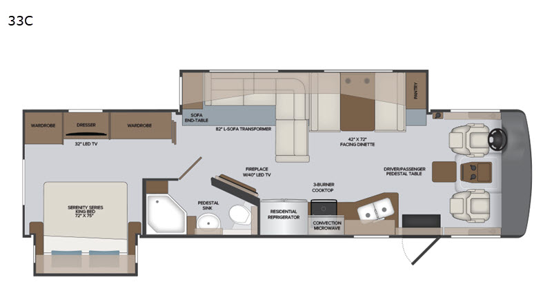 The 33C floorplan offers a room-by-room layout that feels like home. With a private rear bedroom, a well-appointed kitchen, and a spacious living area, every space is optimized for comfort and convenience. Whether you’re lounging after a day of adventure or prepping dinner on the road, this coach delivers ease of use and thoughtful design.
