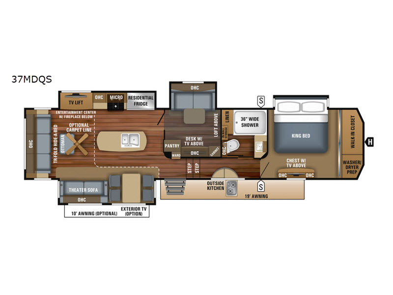 Traveling with your family at the peak of comfort and luxury is where you will be in this Pinnacle fifth wheel. Model 37MDQS provides a unique den/office with a desk, a sofa and table, storage, plus a loft above. So if you are a person that likes to work while away from home, this is a perfect solution. Both of these areas provide extra sleeping space for the kids or overnight guests. You can rest on the Jayco luxury sleep system with a Simmons residential foam-top mattress, and watch a 32" LED HDTV all while washing your clothes in the optional washer and dryer closet. The bathroom provides an oversized residential shower allowing you to get ready for the day in comfort. There is a large living and kitchen area thanks to the dual slide outs. You will find kitchen appliances, a ceiling fan, a center island, theater seats, and much more in this combined room. There are many more features to want, and options to choose from.