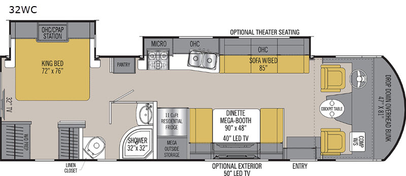 - Expansive Living Space: The 32WC’s large slide-outs create a spacious living area with theater seating, a dinette, and a sofa, giving you a true home-like experience wherever you are.