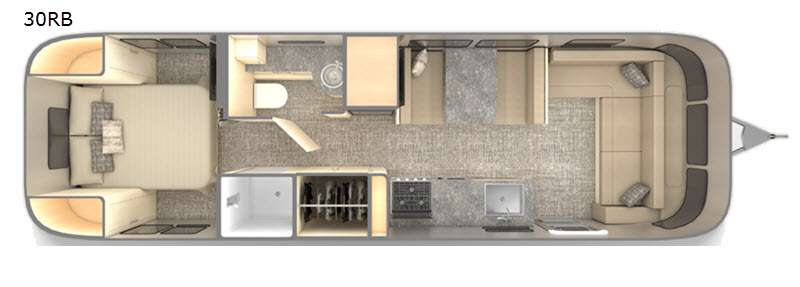 Rear Bedroom Floorplan (RB): The private rear bedroom features a walk-around queen bed, panoramic windows, ample storage, and a relaxing, cozy atmosphere for restful nights on the road.