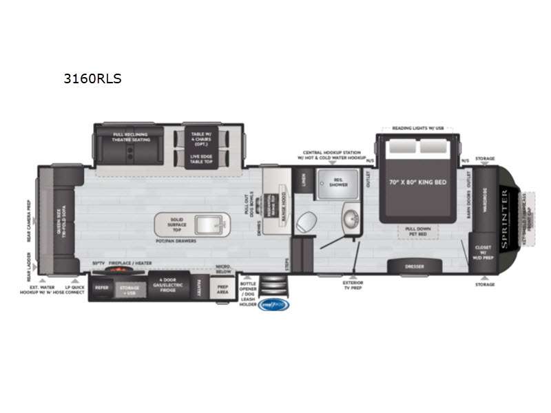 Explore More, With Comfort and Style: The Keystone Sprinter 3161FWRLS is more than just a fifth wheel—it’s a luxurious home on wheels designed for families and pet lovers who desire comfort and style while exploring the great outdoors. Whether it's weekend getaways or embarking on a full-time RV lifestyle, this model ensures every journey is comfortable, convenient, and memorable. Visit us today to experience how the Sprinter can elevate your travel adventures to new heights!