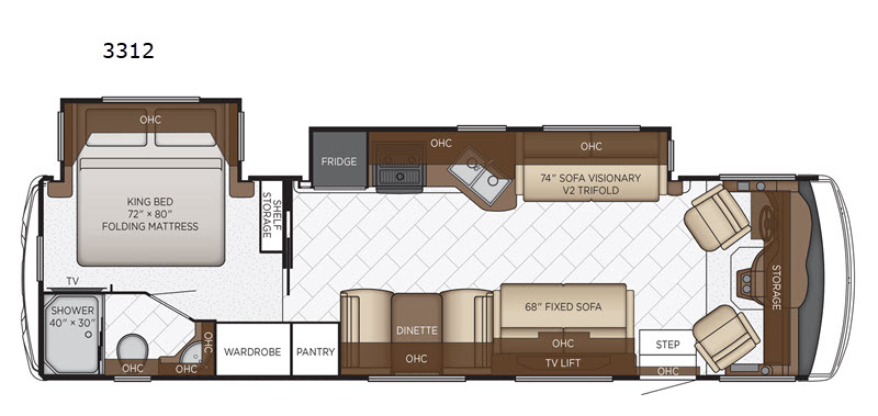 Seeing new sights has never been easier than in this motorhome that features double slides and comfortable seating space. The grandkids can tag along since there is extra sleeping space on the sofa visionary V2 tri-fold sofa, the fixed sofa, plus the booth dinette. You and your spouse will appreicate the master suite that includes a king bed with a folding mattress and a large wardrobe for your clothes. The chef of the family can make dinner on the recessed three burner range or use the stainless steel microwave, and the large pantry can hold all the dry goods.