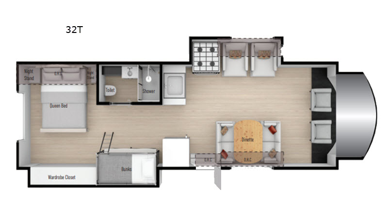 With this Triumph Class C gas motorhome, all of your adventuring dreams will finally be attainable! The set of bunk beds and bunk over the cab create compact sleeping spaces that help this coach sleep seven people comfortably, and the two slides provide the extra space needed to deliver those accommodations. You will also fully appreciate having your own full bathroom on board, and the residential refrigerator and over-the-range microwave in the kitchen will help you create hearty meals throughout each of your trips.