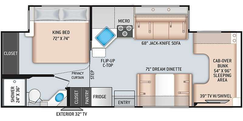 The Freedom Elite 27FE offers a spacious and thoughtfully designed floorplan that makes life on the road feel like home. With a full-wall slide-out, you’ll enjoy an open living area perfect for relaxing or entertaining. The rear private bedroom includes a walk-around queen bed with plenty of storage, while the cab-over bunk and convertible dinette ensure everyone has a comfortable place to sleep. The fully equipped kitchen comes with a three-burner cooktop, microwave, refrigerator, and ample counter space, making it easy to cook your favorite meals wherever you roam.