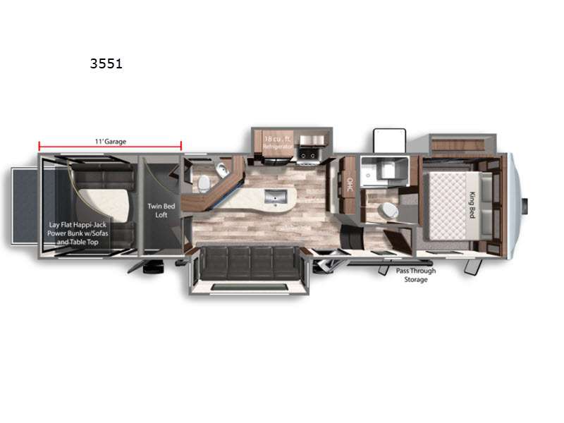 With an 11' garage, this model has more than enough space for your ATVs, motorcycles, or other gear. The Zero Gravity ramp door, rugged tie-downs, and high weight capacity make loading and unloading a breeze. Use the garage as a gear room, party space, or convert it to sleeping quarters with the Happi-Jack power bunks and half bath.
