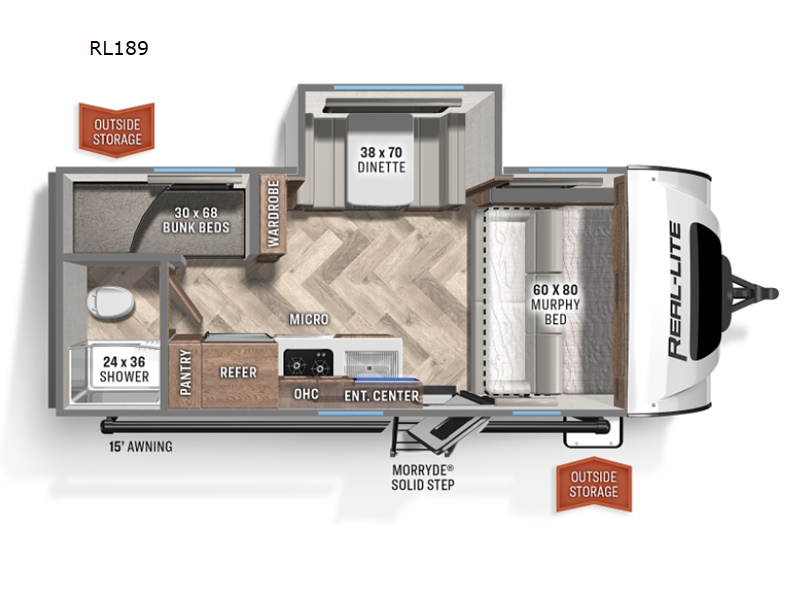 Bunkhouse & Murphy Bed: Includes rear bunks and a front queen Murphy bed/sofa combo, plus dinette slide-out—perfect for cozy family camping.