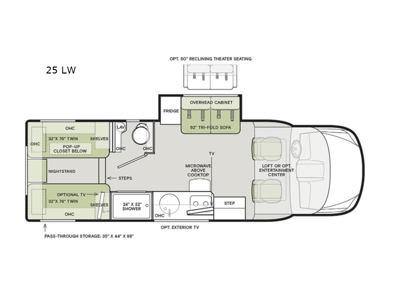 - Two Twin Mattresses (32" x 76") Pop-up Closet Storage on Driver Side (25 LW)