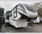 Enjoy each and every vacation, month-long trips, or even extended stays at an RV park in this spacious fifth wheel! The raise rear kitchen gives the cook plenty of room to whip up any type of meal using the stainless steel appliances including a 24" residential oven, an oversized pantry, and the raised bar top will provide you even more counter space on top of dining with two chairs that overlook the middle living area. Relaxing is made easy thanks to two tri-fold sofas and theatre seating while watching the big game on the LED Smart TV and enjoying the fireplace below. Dual sinks in the full bathroom allow two people to easily get ready at once, and the flip up teak seat in the shower is a nice convenience. At night, retire to your own queen bed which slides out to provide more floor space, and enjoy a show on the LED TV above the flip-top dresser once in bed.