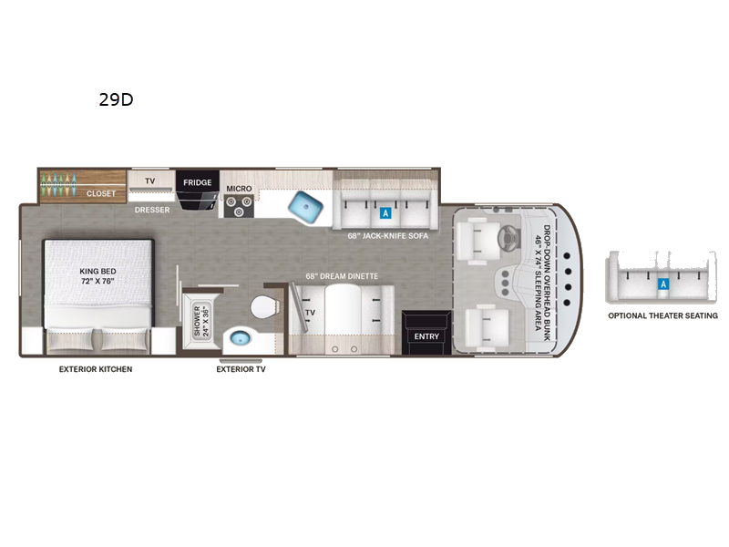 Wherever you decide to roam, you will be met with at-home comforts in this Resonate coach! Once you arrive at your destination, the swivel captain's chairs can become a part of the living area, and your guests can relax on the jack-knife sofa or Dream Dinette. The little ones are sure to love the drop-down overhead bunk, and there is a 39" LED TV in the living area to enjoy a movie together. Within the spacious kitchen you'll find a double door refrigerator, a microwave oven, plus a large double bowl stainless steel sink for easy clean-up, and the mid-coach full bath is easily accessible for everyone. The rear private bedroom will feel just like home with its king bed and 32" LED TV, plus there is a dresser and a closet to keep your clothes wrinkle-free. This model also includes an outdoor kitchen with a refrigerator, a sink, and a 1,000-watt inverter!