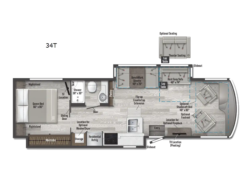 Sleek Design: Measuring 35'6" in length and 12' in height, the Forza 34T features a striking exterior with full-body paint options like Silvermist II, ensuring you travel in style.