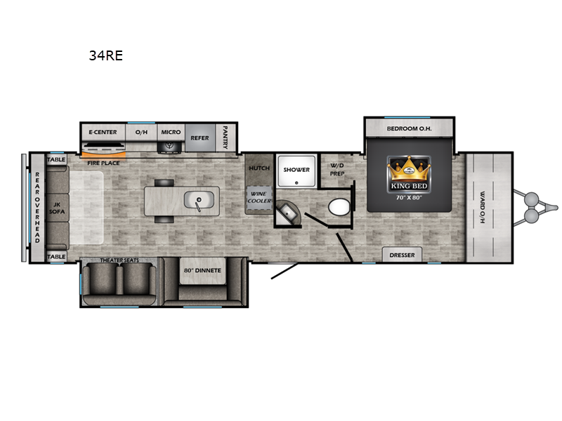 The three slide-outs expand the living, dining, and bedroom zones so the 34RE feels more like a small apartment than a cramped trailer.