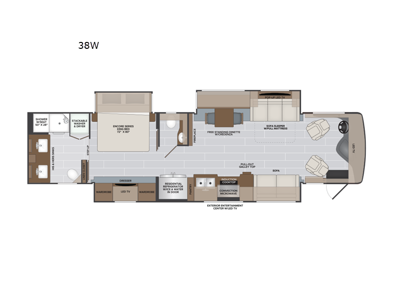 Whether you travel for business, pleasure, or both, you will appreciate all the comforts and luxury found throughout this coach! There is a spacious master bedroom with a king bed, dual wardrobes and an LED TV above a dresser, and a rear full bathroom with two sinks. You will be able to keep everything clean using the stackable washer/dryer, and there is a linen closet for storage. The mid-coach half bath is convenient especially when you have guests, and the sofa sleeper with a full mattress and the second sofa offer more sleeping space. And you might like to add the Hide-A-Bed power drop-down overhead bunk option so you can invite more overnight guests. The kitchen will make any cook happy with a convection microwave, a residential refrigerator with ice and water in the door, and the style of the polished solid surface galley countertop with lighting.